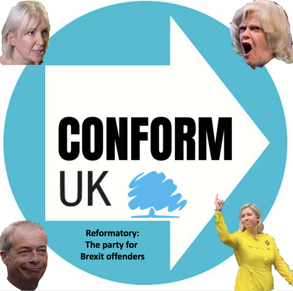 Reform UK have had to rebrand the party in order to cope with the “swarms of failed Tories” that are now infecting their party. Honest Bobby J joins useless Nadine Dorries and Andrea “the finger) Jenkyn this week. Quite surprisingly, The Trussmeister has not joined yet. We can presume that she’s simply too toxic to be accepted by NF. Boris must be waiting in the wings to pounce on Bad Enoch at her maximum point of weakness. Although anything is possible in our disruptive politics, I think that Boris + Nigel may fall into the category of what Sparks called “This town ain’t big enough for the both of us”. Here are the new logo designs. Feel free to use them in your work and thank you to JP Flowers for converting my CONform concept into the initial design.